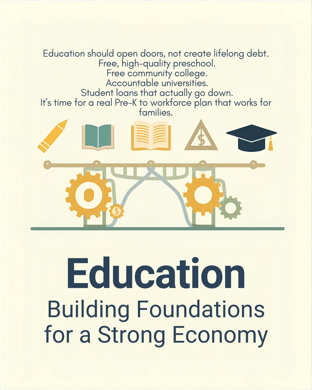 Free, quality Pre-K (mixed-delivery: public, community-based, Head Start partners) so parents can work and kids start kindergarten ready.